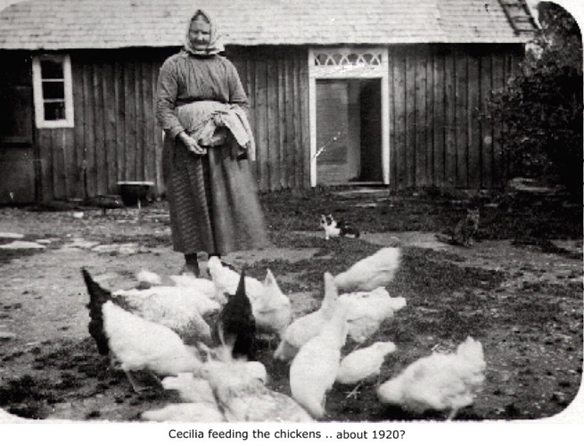 Cecilia feeding chickens.1920?